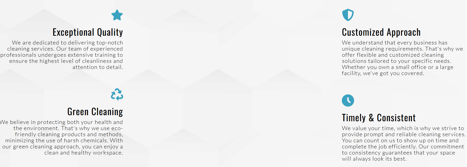 We believe that what sets us apart from other commercial cleaning companies is our unwavering commitment to quality, customer service, and professionalism. We understand that each client is unique, and we work closely with you to create a customized cleaning plan that meets your specific needs and fits your budget. Our team consists of highly trained professionals who take pride in their work and are dedicated to delivering exceptional results every time. We use only the latest cleaning equipment and eco-friendly cleaning products to ensure that your property is cleaned safely, efficiently, and to the highest standards of hygiene. With our attention to detail, dependable service, and competitive pricing, you can trust us to keep your commercial property clean and well-maintained.
